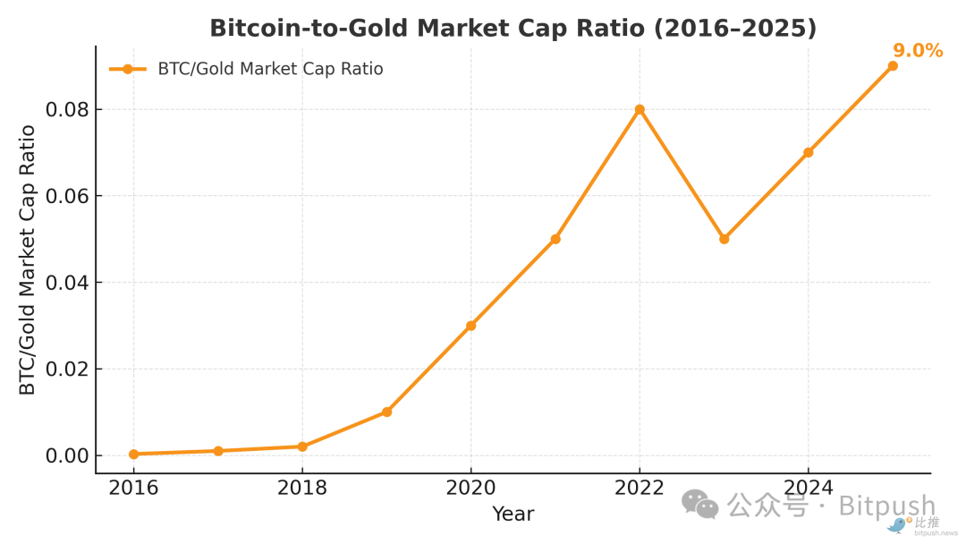 从更宏观的视角看,比特币在传统金融体系中仍是一个“轻量级选手”。尽管市值已达2.1万亿美元,但这仅为黄金市值的1/14,在全球金融资产中的占比不足2%。正是这种巨大的“市值差距”,被机构视为未来的增长空间。