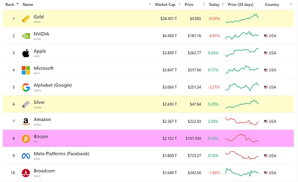 据 companiesmarketcap 统计显示,目前在全球 Top10 资产中,黄金处于绝对领先地位,其总市值规模(28.4 万亿)远超后面 9 名之和(26 万亿)。