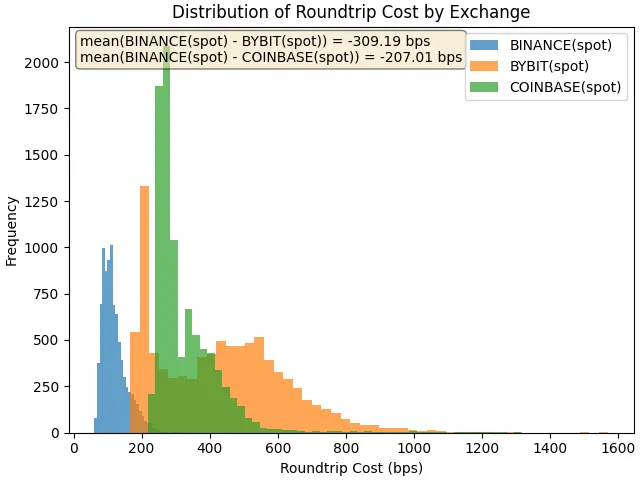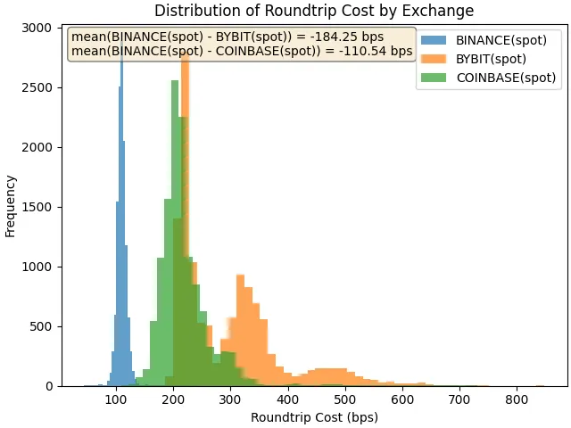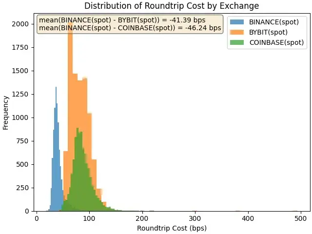 就 ONDO 而言,币安和 Coinbase 之间的往返成本大致相似 - Coinbase 略有优势(仅相差 1.77 个基点,可能是由于最小变动价位差异造成的)。