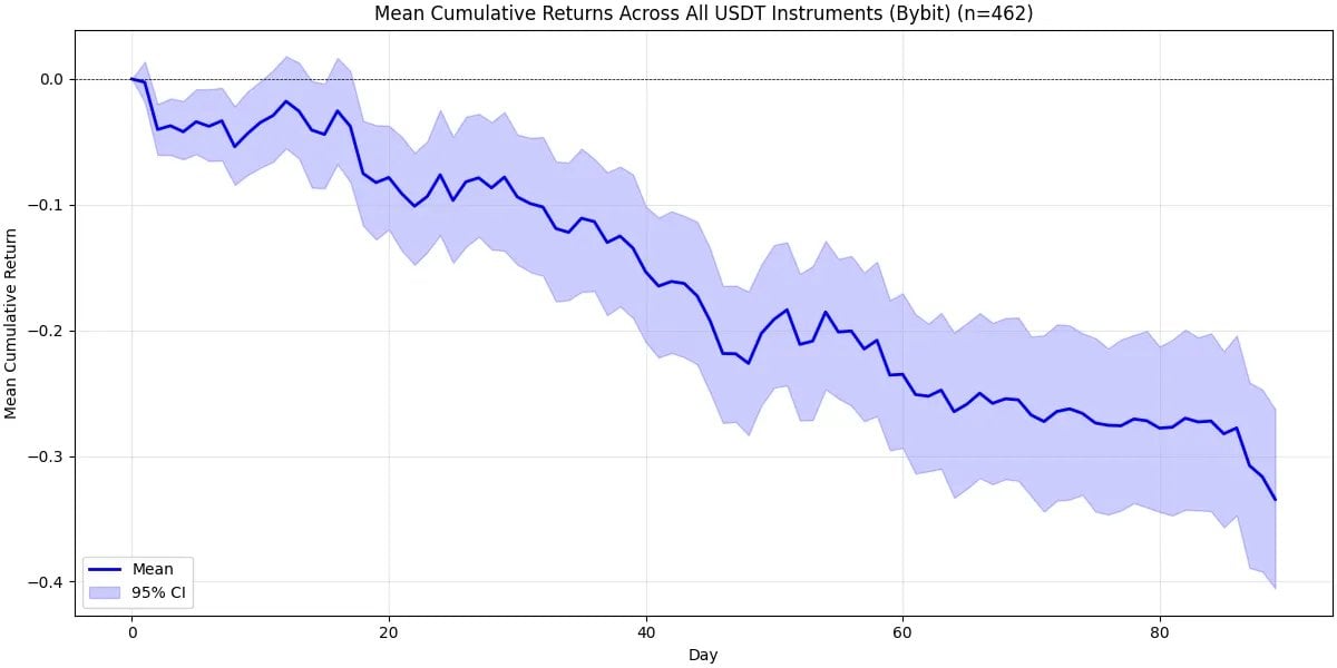 这是所有符合我标准的代币在币安现货市场上市后前 90 天的累计收益。我们看到了什么?从一开始就存在巨大的——绝对巨大的——抛售压力。几天后,情况稍微稳定下来,然后我们进入稳定的下跌趋势。为什么会这样?部分原因是由于整体加密货币市场趋势。平均而言,代币在上市后往往会向下波动。此外,我选取了 2022 年 1 月 1 日之后上线的所有代币,当时正值牛市之后,因此整体环境并不十分有利。