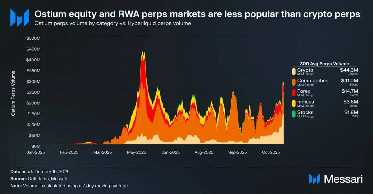 例如,Ostium 平台的日均股票永续合约交易量仅为180万美元,而加密货币永续合约的交易量则高达4430万美元,显示出市场需求较弱。