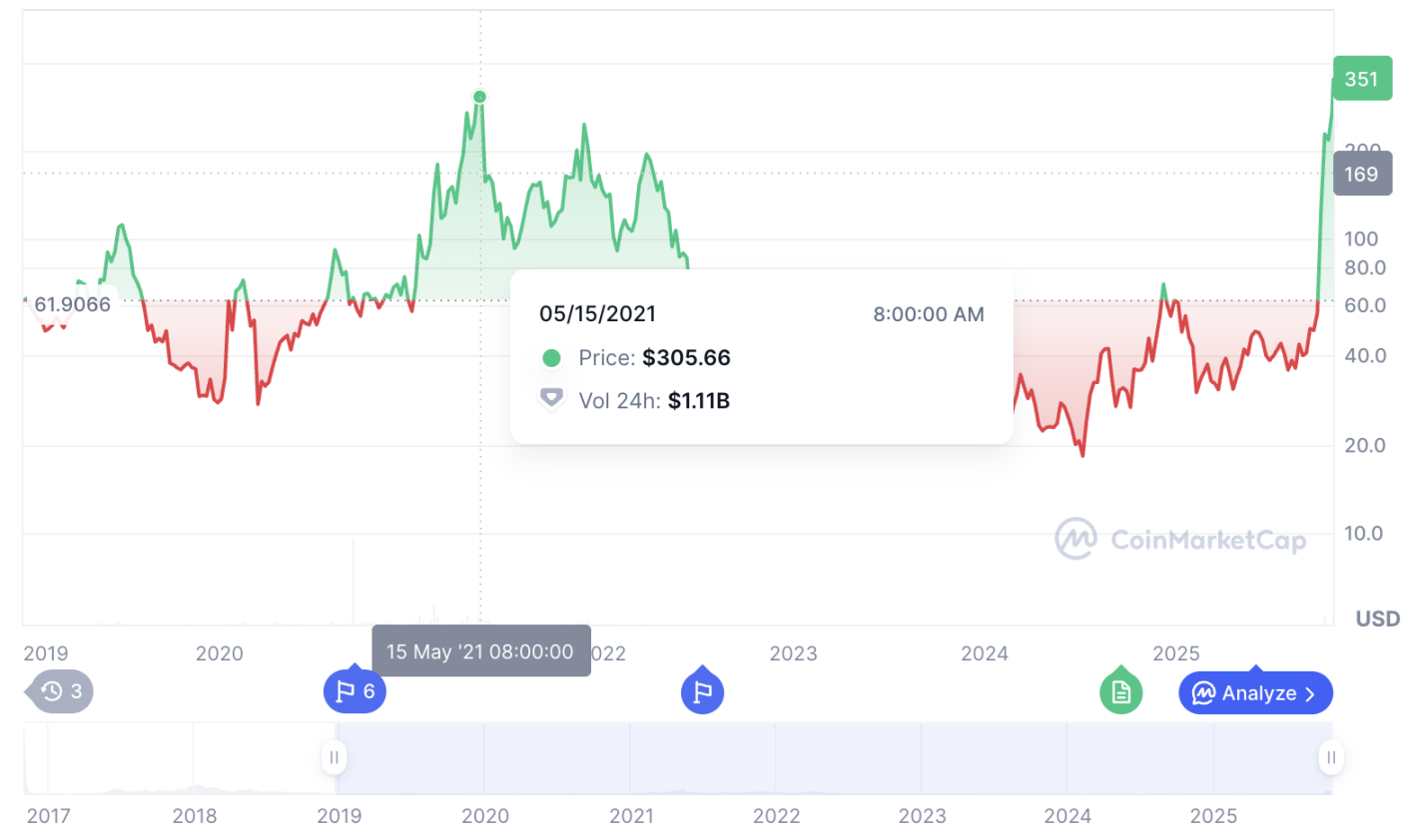 这一价格较 2021 年 5 月 8 日 319 美元的收盘价高出 11.5%,但根据 CoinGecko 数据,较近九年前创下的 3191.93 美元历史峰值,仍下跌 88%。