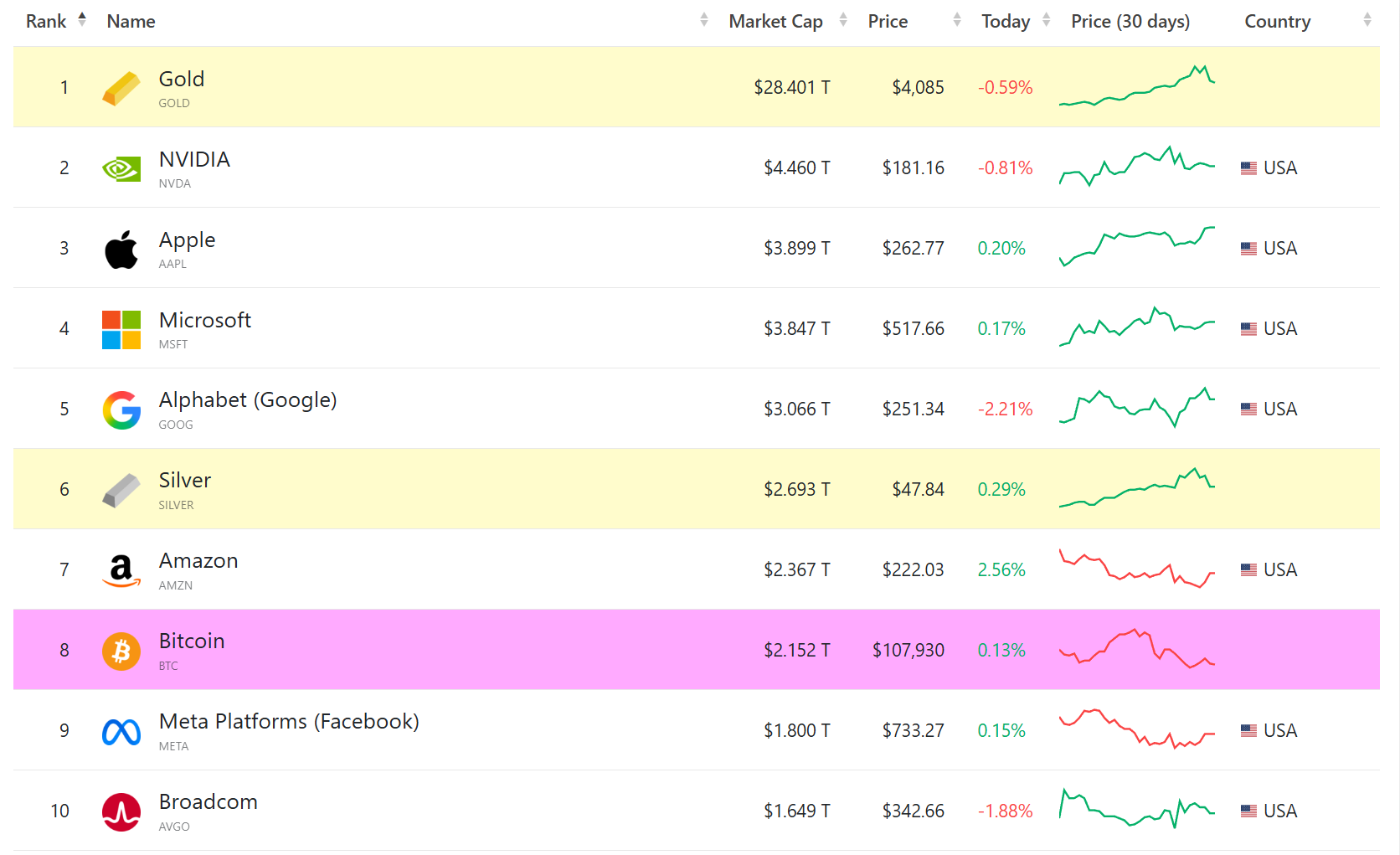 据 companiesmarketcap 统计显示,目前在全球 Top10 资产中,黄金处于绝对领先地位,其总市值规模(28.4 万亿)远超后面 9 名之和(26 万亿)。