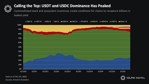 Tether 与 Circle 的护城河正在被侵蚀:分发渠道胜过网络效应。Tether 和 Circle 所占据的稳定币市场份额,可能已经在相对意义上触顶——即便稳定币的总体供应量仍在持续增长。预计到 2027 年,稳定币的总市值将突破 1 万亿美元,但这一扩张的收益不会像上一个周期那样主要流向既有巨头。相反,越来越多的份额将流向「生态原生稳定币」与「白标发行(white label issuance)」策略,因为区块链和应用开始将收益与分发渠道「内生化」。