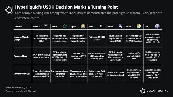 在 USDH 的竞标过程中,几乎所有主要的白标稳定币发行方都参与其中,包括 Native Markets、Paxos、Frax、Agora、MakerDAO(Sky)、Curve Finance 以及 Ethena Labs。这是稳定币经济在应用层的首次大规模竞争,标志着“分发权”的价值正被重新定义。