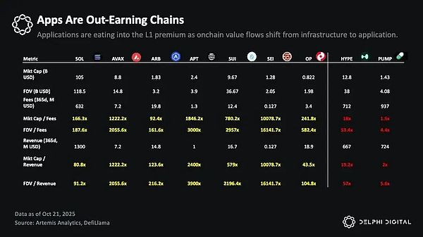 这是一场正在进行的权力转移。应用层的估值正日益取决于它们创造并返还给生态系统的真实收入,而公链层仍在艰难地寻找自身估值的合理性。不断削弱的 L1 溢价,正是最清晰的信号。