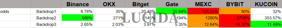从数据中可以明显看到,在三个观察周期中,MEXC 和 Bybit 的赔率表现稳居第一梯队。换句话说,在这里,你更有机会用更少的「试错成本」,捕捉到那些一飞冲天的标的。