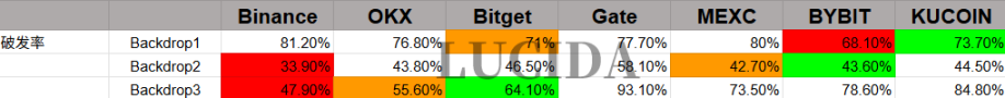 结果显示,Binance 在控制破发率上展现了老大哥的稳健,通常保持最低。Bitget 与 Bybit 同样表现可靠。而 Gate 在三次评比中均未进入前三,需要打新的你多一份警惕。