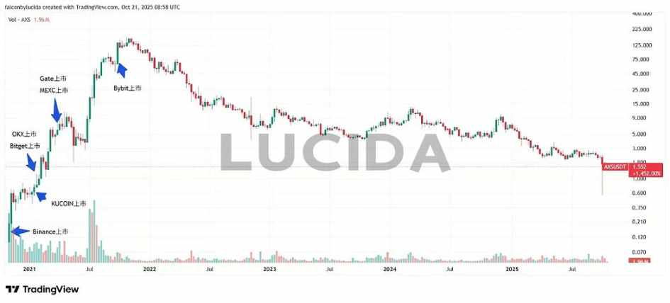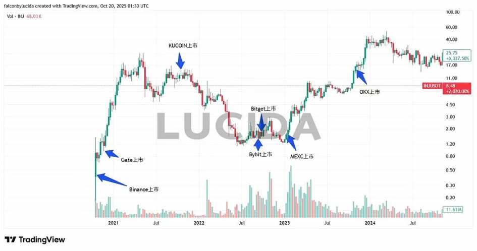 首发于 MEXC 和 Binance,下跌后开启长牛。Gate 上线在阶段性高点,Bitget 上线于低位平台后迎来上涨,KuCoin 上线后即回调,而 Bybit 和 OKX 则在新一轮行情爆发前精准布局。
