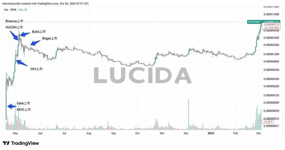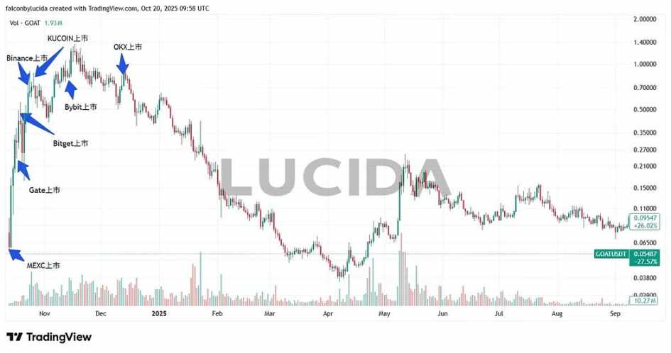 MEXC 首发,并在上涨途中获 Gate、Bitget、Binance、KuCoin 陆续上线。当 Bybit 和 OKX 上线时,盛宴已近散场。