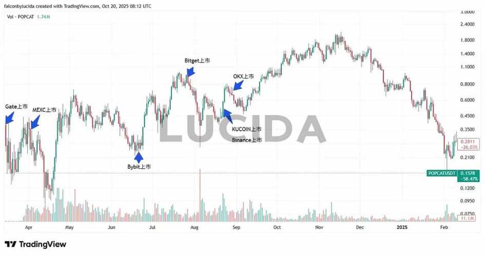 以 PEPE、POPCAT、FARTCOIN 为代表,Meme 币的生命周期极短,上市速度直接决定收益。MEXC 和 Gate 持续扮演「Meme 首发站」角色,几乎包揽了所有早期明星 Meme 币的首发。OKX 和 Binance 虽然上市较晚,但凭借庞大的用户基础,仍能推动币价进入第二波主升浪。