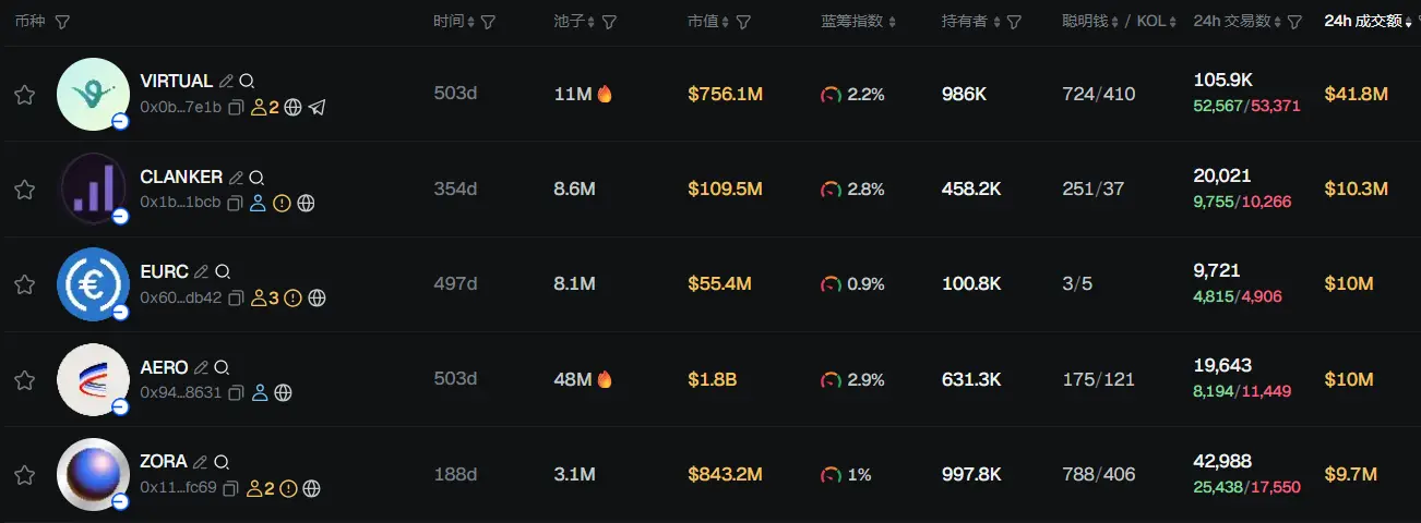 过去 24h Base 热门代币前五依次为:VIRTUAL、CLANKER、EURC、AORA、ZORA
