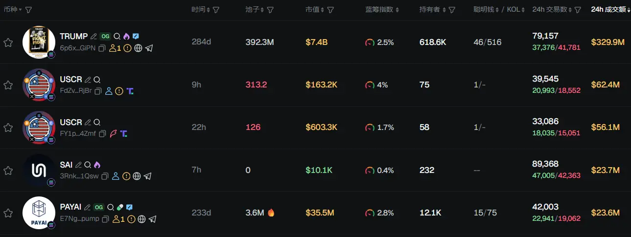 过去 24h Solana 热门代币前五依次为:TRUMP、USCR、USCR、SAI、PAYAI
