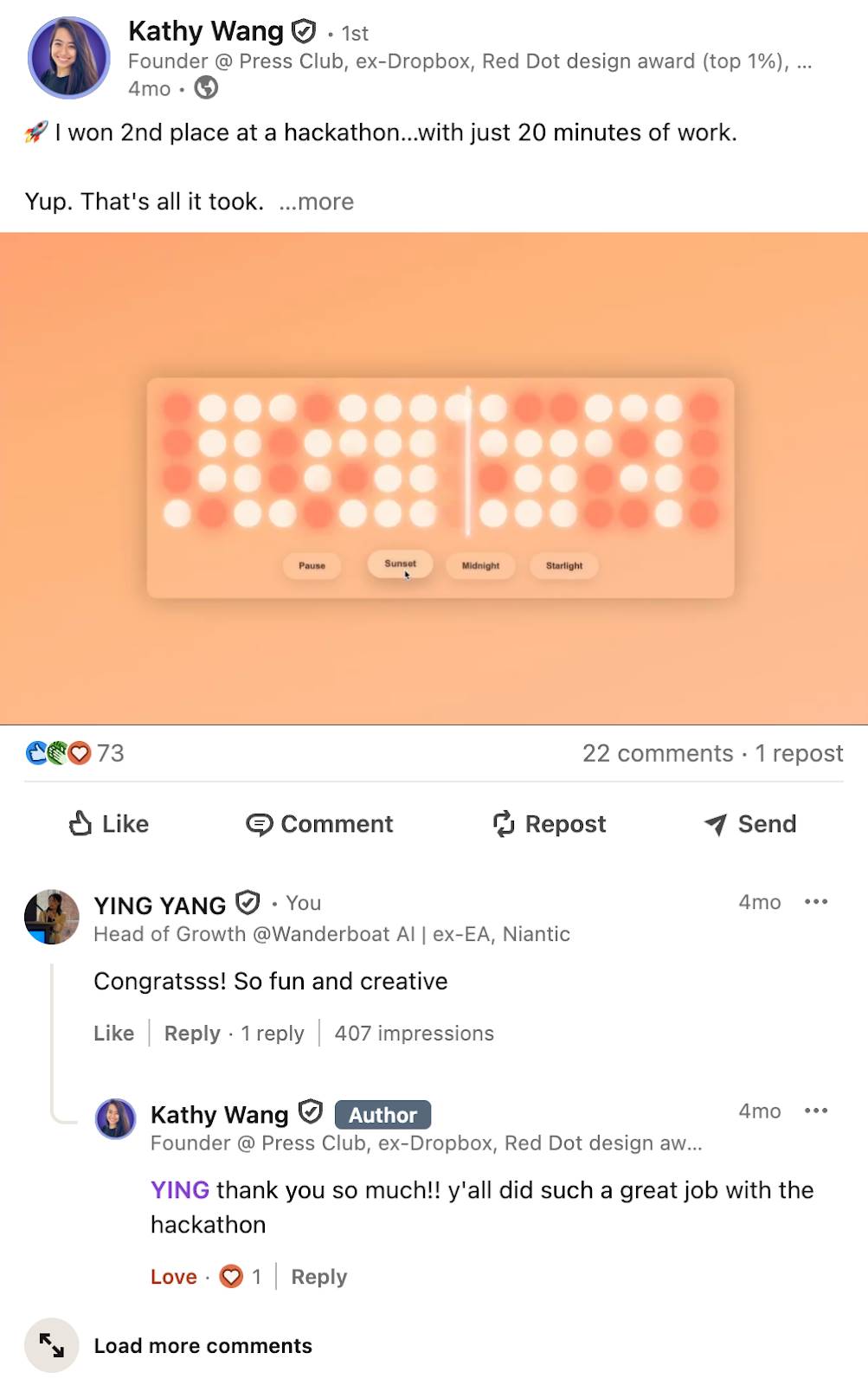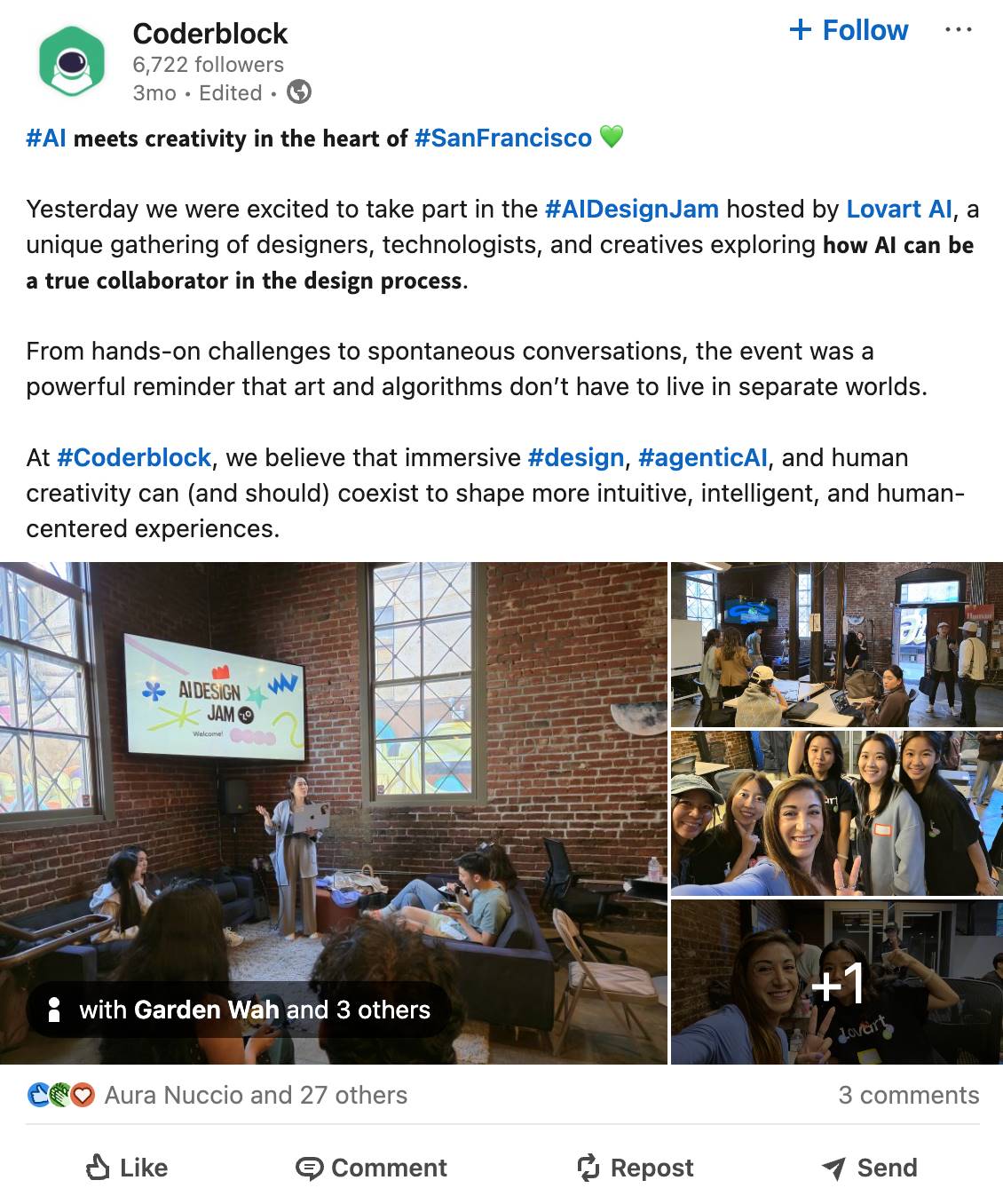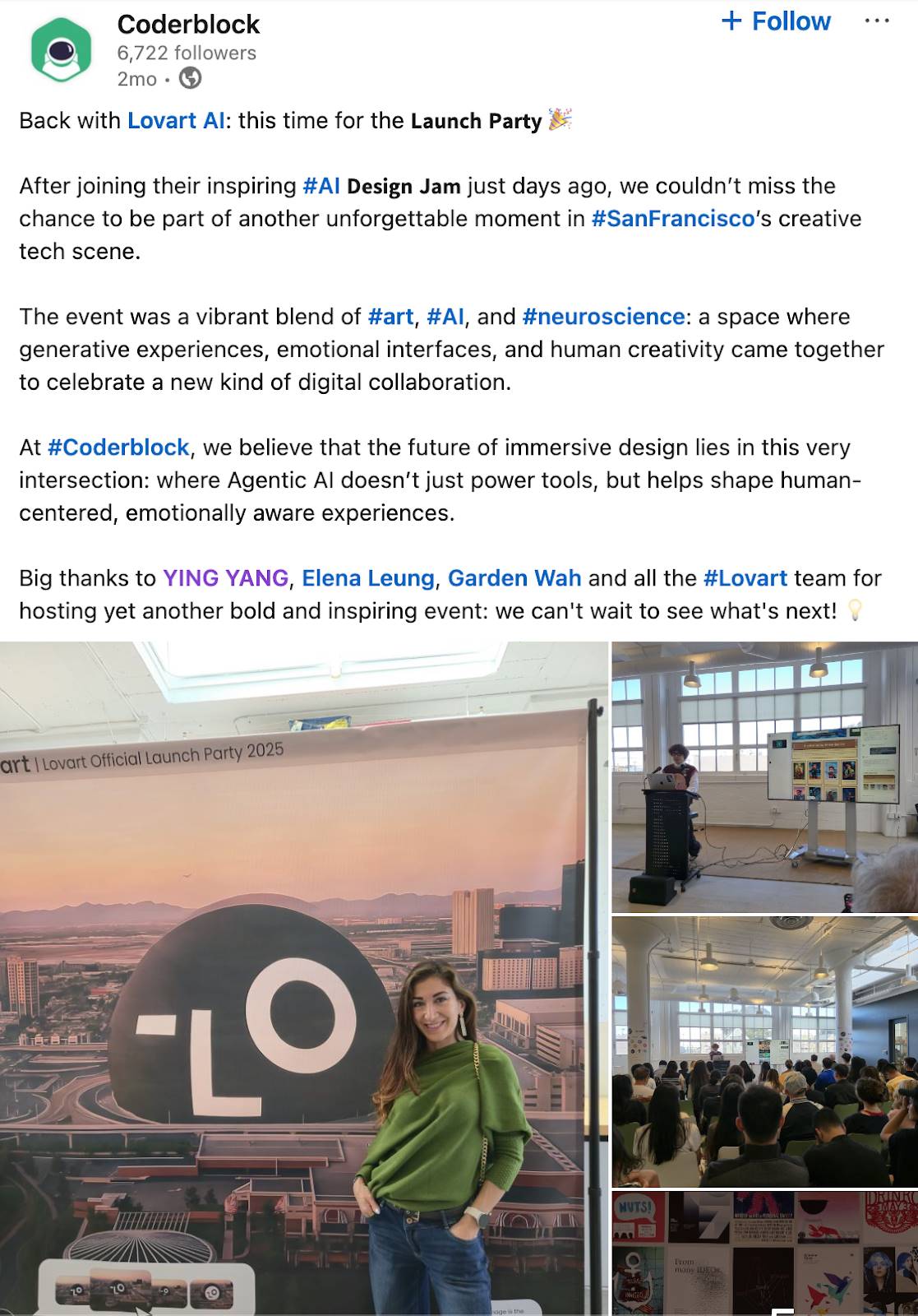 紧接着,杨莹并未墨守成规。她深入考量了 Lovart 当时的增长痛点和产品处于案例积累的阶段性需求,果断放弃了延续她在 Manus AI 期间成功举办的“Vibe Coding/Designing”形式。取而代之的是,她策略性地策划了一场小而精、私密性极高的高质量工作坊。其核心目标非常明确:高效地“孵化”并沉淀出具备传播价值的优质应用案例,为后续产品市场契合度(PMF)的验证和规模化营销传播做好扎实的战略储备。硅谷初创 Coderblock 的设计主管 Aura Nuccio 在参加这场活动后,专门发布了 LinkedIn 和周报,赞扬活动是“a unique gathering of designers, technologists, and creatives exploring how AI can be a true collaborator in the design process”,极大地提升了活动的行业影响力。这个具体的案例,充分体现了杨莹灵活应变的智慧和务实的战略思维——她不被先前的成功经验所桎,而是在每个关键时间节点上,都选择对产品最适宜的增长路径。