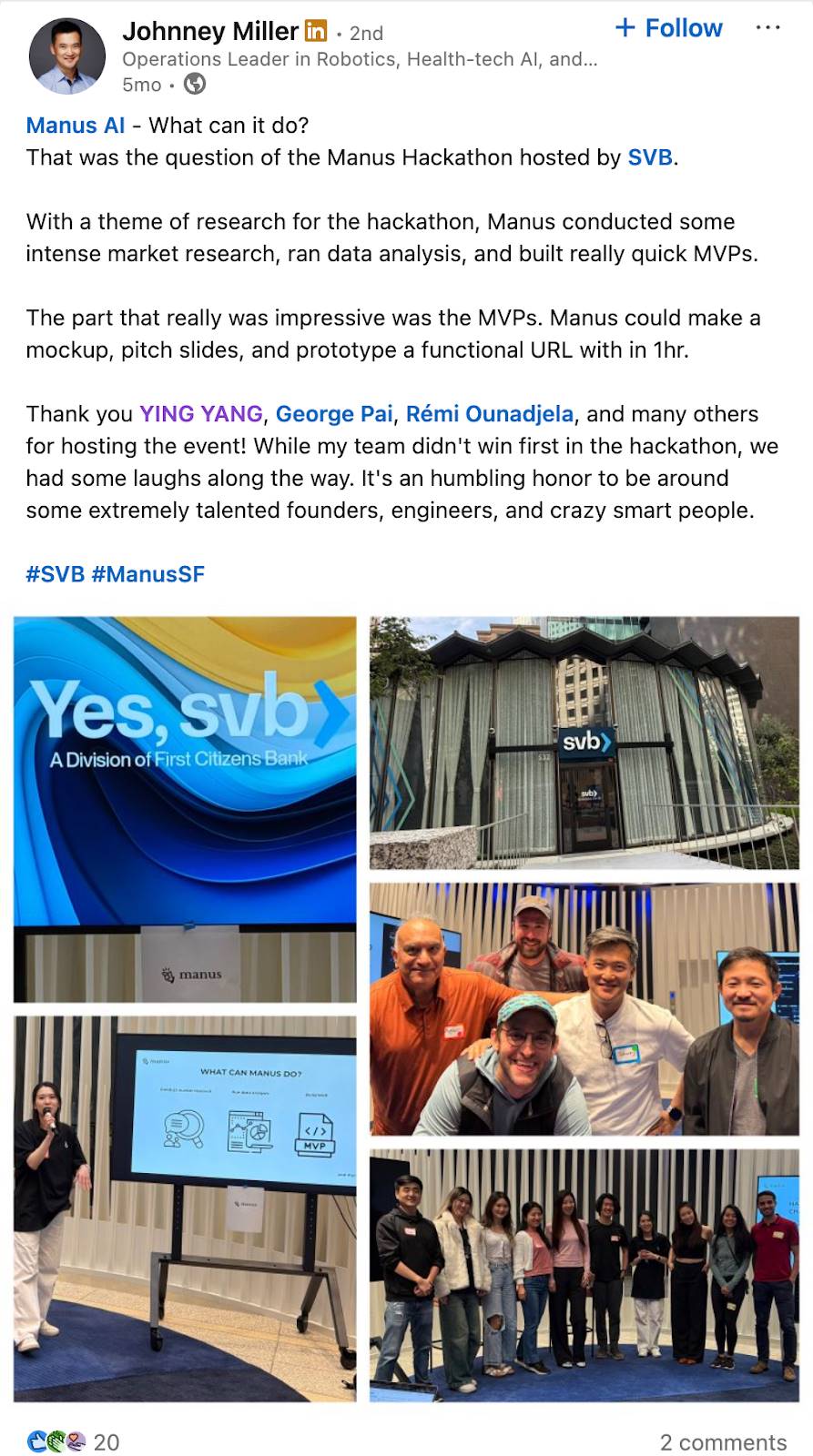 杨莹于四月底正式加入Manus AI Fellow,并在短短半个月后,即5月14日,迅速地组织了Manus在旧金山的首场“Vibe Coding”活动。这场活动凭借其精准的定位,吸引了约千人次的注册量,参与者质量极高,来了很多创始人、资深产品经理、设计师和开发工程师这些核心用户群体。活动以“深度市场调研”为主题,要求所有到场者分组,在短短1至2小时内跑出一份具体方向的市场调研报告及演示文稿。最终,超过百名参与者到场,现场气氛极其活跃,思维碰撞出无数灵感的火花。活动结束时,有约15个团队展示了他们非常扎实的成果,其中一个关于婚礼策划的AI项目拿到了第一名。获得第二名的一个团队的产品设计师,甚至在LinkedIn上专门发帖表达赞美,高度肯定了当天的活动创意和互动设计。杨莹不仅在很短的时间内邀请到了AI圈最高质量的一批受众,确保了所有人的优秀活动体验,更开始了她的思考:这样的模式长期来看该怎么做,才能一直持续不断地让大家对Manus保持活跃度和粘性?