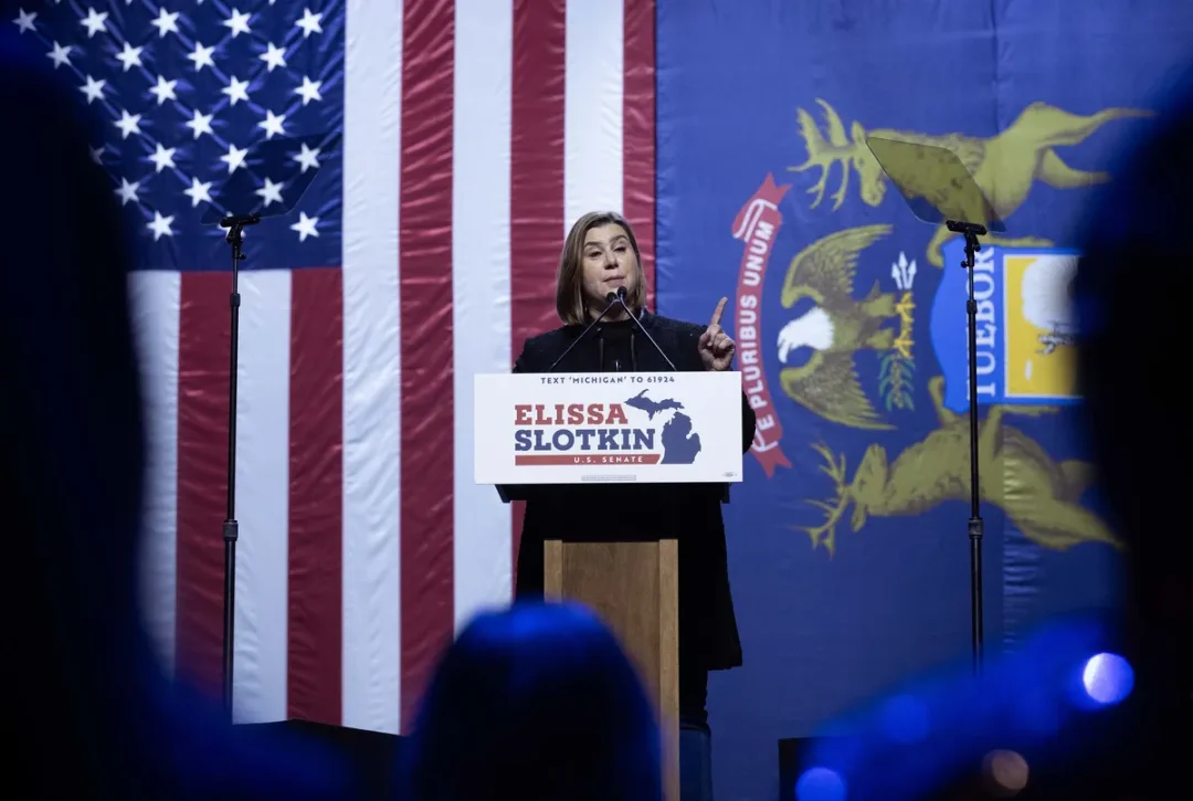 2024 年 11 月,参议院候选人埃莉莎・斯洛特金在底特律的选举夜活动中向支持者发表讲话