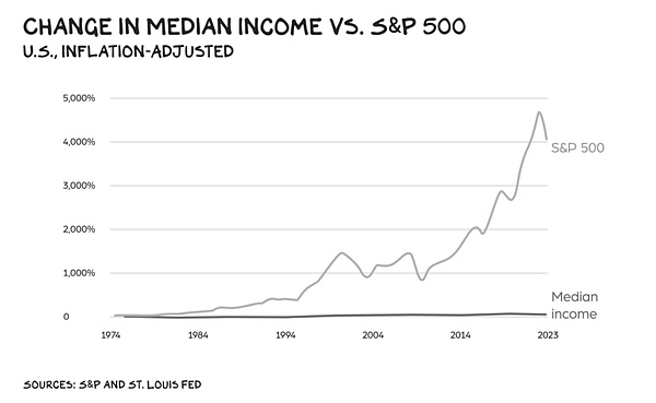 这意味着如果你在 1974 年有 1 万美元,把它投资进标普 500,到 2024 年会变成 40 万美元。但如果你在 1974 年开始工作,靠工资一点点存钱,到 2024 年,能买到的东西只比当年多 40%。