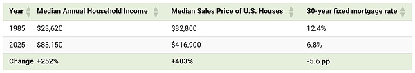1985年和2025年美国收入、房价与贷款利率中位数对比|图源:Visual Capitalist