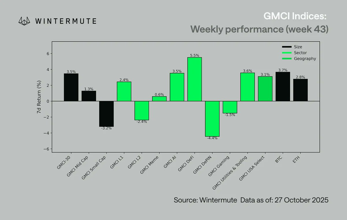随着美国CPI数据走软以及特朗普与习近平关系改善的消息提振市场情绪,风险偏好正在回归。债券收益率下行,市场波动性下降。比特币因ETF资金流入和空头回补重回11.5万美元关口,而去中心化金融(DeFi)和人工智能(AI)板块领涨复苏。市场仓位得到清理,流动性改善,为11月的持续动能奠定了积极基础。