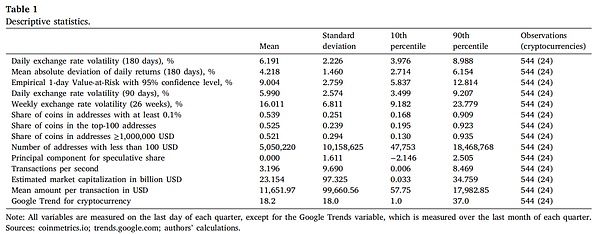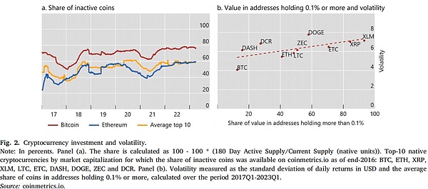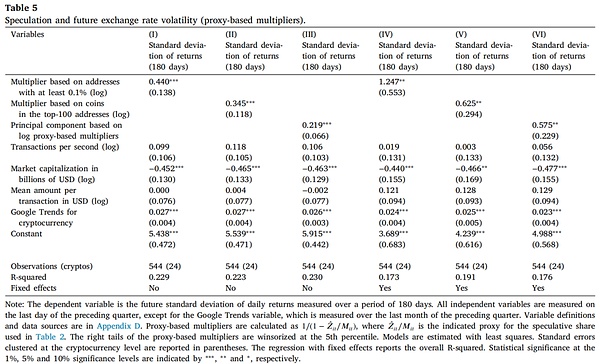 为验证加密乘数的现实相关性,作者选取24种区块链原生代币,收集其2014年至2023年的季度数据,涵盖价格、区块链交易与地址余额等信息。被解释变量为未来180日收益率的年化标准差,核心解释变量为三个投机持有比例的代理变量,分别为:地址余额超过总供给0.1%的代币份额;前100大地址持有的代币份额;基于上述变量及“余额超100万美元地址份额”与“小额地址数量”构建的主成分变量。