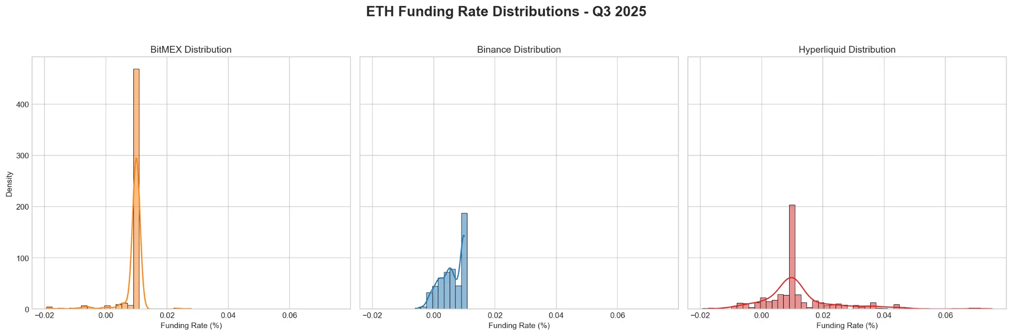 | 最小值/最大值 | -0.0194% / 0.0276% | -0.05% / 0.10% | Hyperliquid 的交易范围在两端都显著更宽。 |