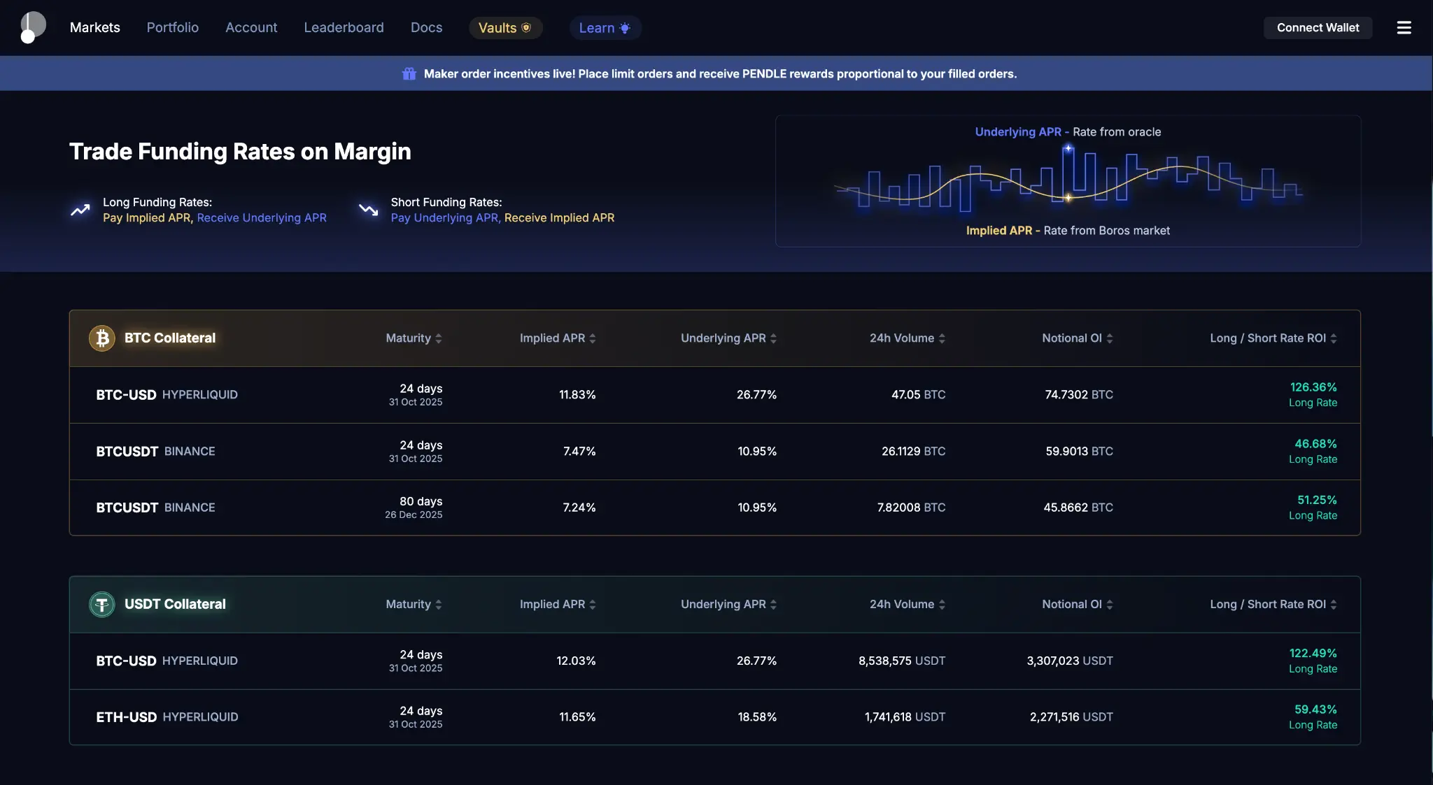 导航到Boros 平台 并连接您的钱包。根据您的论点,您将做多或做空隐含资金费率。