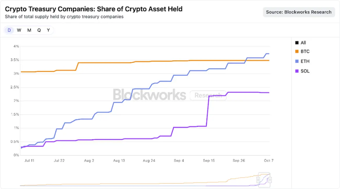 目前市场开始向大市值资产聚集,多家资金雄厚的 DAT 正竞相囤积 ETH 和 SOL。如下图所示,聚焦 ETH 的 DAT 合计持有以太坊供应量的 3.74%,Solana 系 DAT 持有 SOL 供应量的 2.31%。