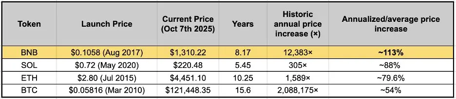 在多个市场周期中,BNB 相对于同类的 Layer-1 区块链和基准数字资产,表现出了一致的结构性优异表现。其价值的长期增长反映了功能实用性、程序化的供应纪律和生态系统规模整合的结合。