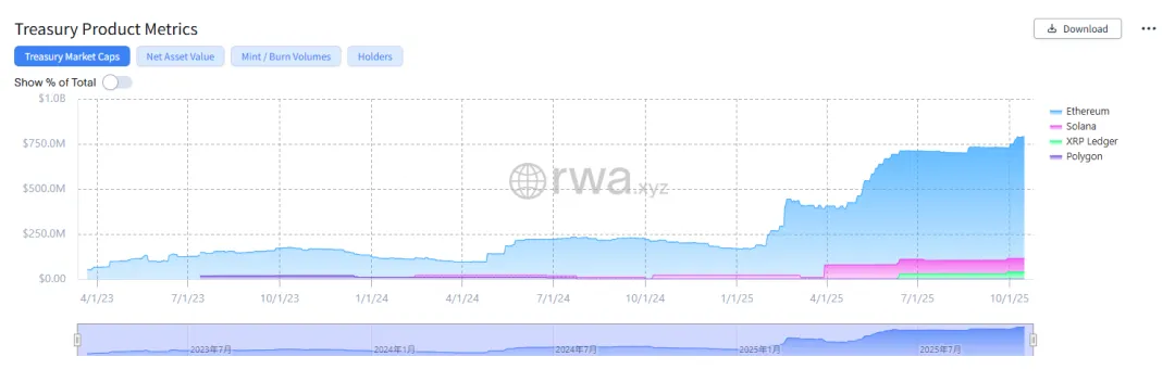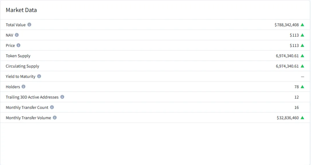 截至 2025 年 10 月,OUSG 的总资产价值约为 7.92 亿美元,其代币净值(NAV)大约 113 美元/枚。在最近 30 天,其二级市场月度转移量大约为 3,285 万美元,流通供应约为 7,011,494 枚,持有人数仅约 79 人、活跃地址约 12 个。从这些数据看,OUSG 已具备规模效应与合规结构。但与此同时,其二级市场活跃度较低,活跃地址和持有人数远低于一般数字资产产品,这反映出其流动性仍主要集中在少数大户或机构之间。