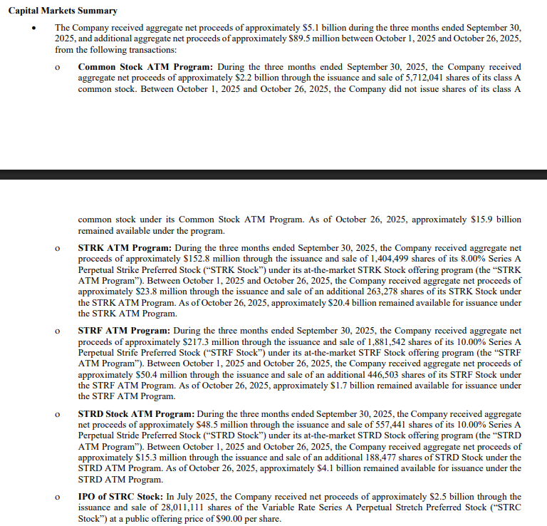 而实际上在 2025 年第三季度的财报表明,截止到 2025 年 10 月 26 日 MSTR 通过多个 ATM 程序的剩余发行额度合计约 421 亿美元,说人话就是 MSTR 最大可以买价值 421 亿美元的 Bitcoin 。