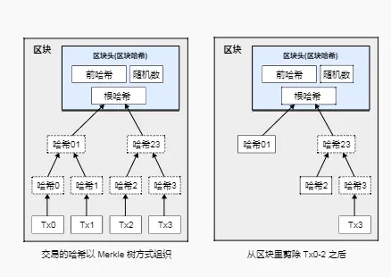 如果一枚硬币最近发生的交易发生在足够多的区块之前,那么,这笔交易之前该硬币的花销交易记录可以被丢弃 —— 目的是为了节省磁盘空间。为了在不破坏该区块的哈希的前提下实现此功能,交易记录的哈希将被纳入一个 Merkle 树[7、2、5]之中,而只有树根被纳入该区块的哈希之中。通过砍掉树枝方法,老区块即可被压缩。内部的哈希并不需要被保存。