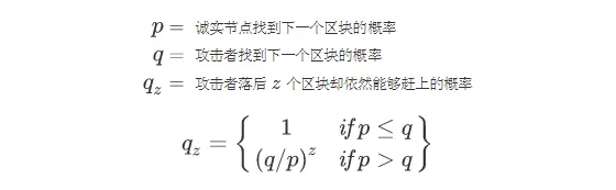 攻击者能够从落后局面追平的概率类似于赌徒破产问题。假设,一个拿着无限筹码的赌徒,从亏空开始,允许他赌无限次,目标是填补上已有的亏空。我们能算出他最终能填补亏空的概率,也就是攻击者能够赶上诚实链的概率[8],如下: