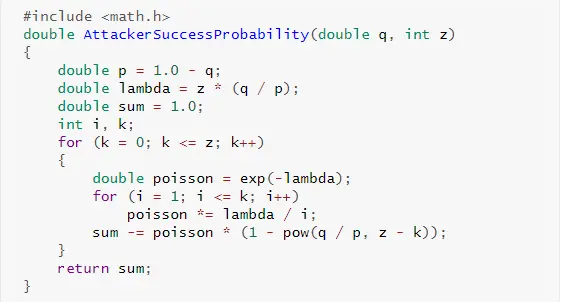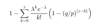 收款人等到此笔交易被打包进区块,并已经有个区块随后被加入。他并不知道攻击者的工作进展究竟如何,但是可以假定诚实区块在每个区块生成过程中耗费的平均时间;攻击者的潜在进展符合泊松分布,其期望值为: