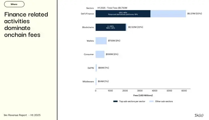 DeFi仍是核心支柱,贡献了总费用的63%,但行业格局正快速演变: