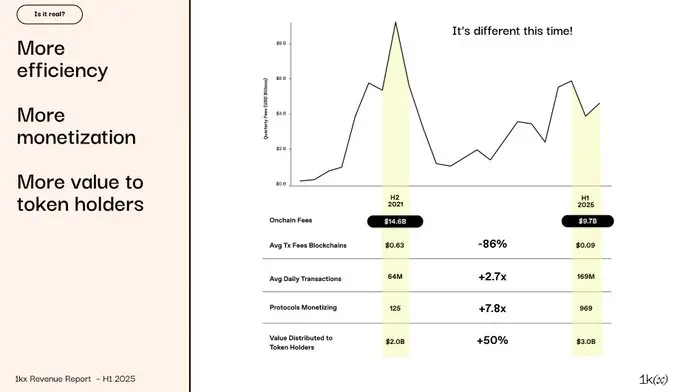 1kx发布了迄今最全面的加密市场链上盈利报告:《1kx链上收入报告(2025上半年)》。报告汇总了1200多个协议经验证的链上费用数据,清晰描绘了用户付费路径、价值流向以及推动增长的核心因素。