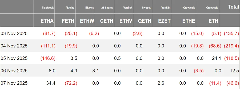 上周流出主要来自贝莱德 ETHA,净流出 2.97 万亿美元。6 只以太坊现货 ETF 处于净流出状态。