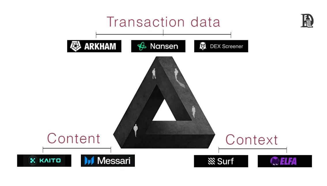 Kaito:爬取 X(原 Twitter)内容,根据影响力和高价值关注者对用户排名,逻辑类似 PageRank。它映射创作者,连接协议,提供可验证的影响力指标,功能类似 Google AdX,但分发渠道是 X。近期它通过启动平台将交易收入纳入体系,围绕加密推特内容构建了一个平行经济。