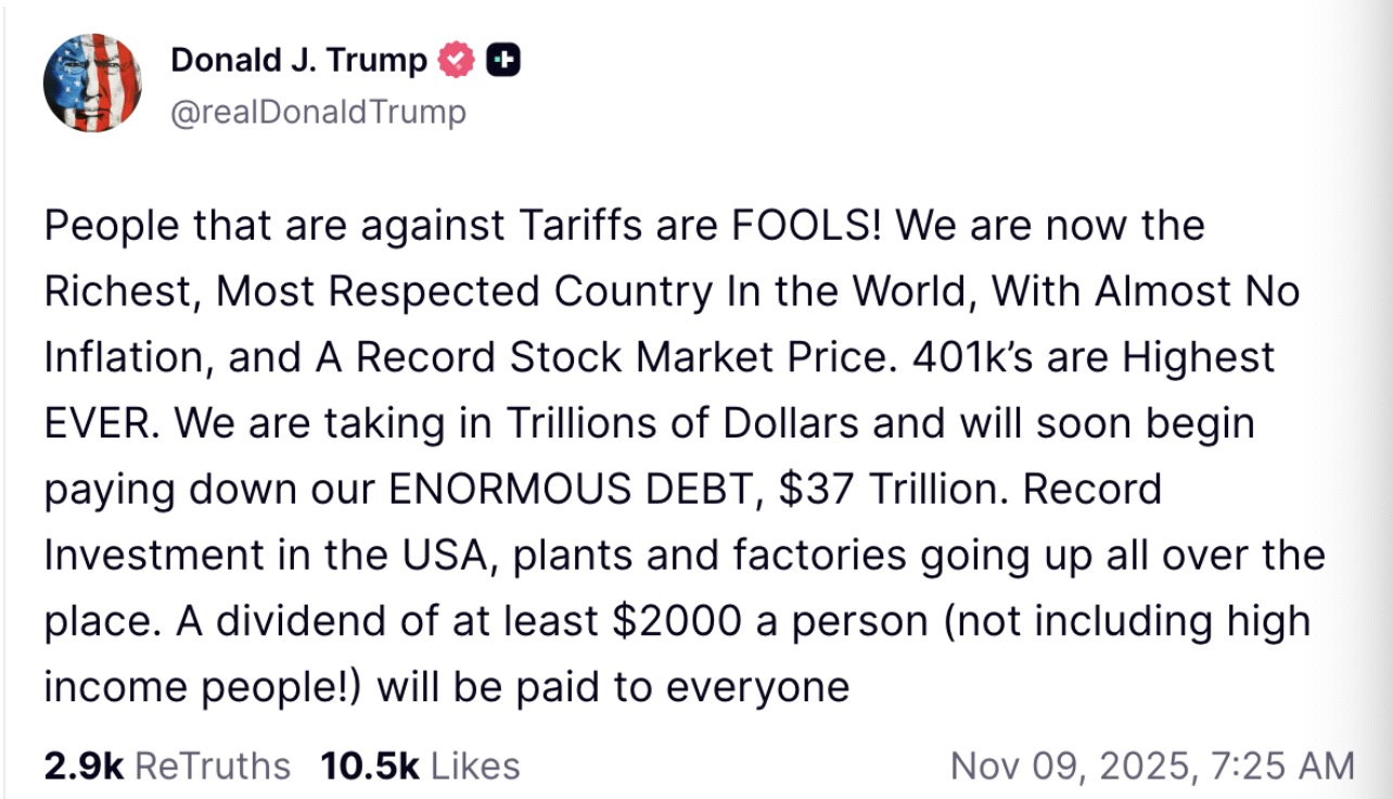 11 月 9 日,他在 Truth Social 上正式宣布计划:「我们正在收取数万亿美元,并很快开始偿还我们巨大的债务。每个人(不包括高收入人群!)将获得至少 2000 美元的红利。」