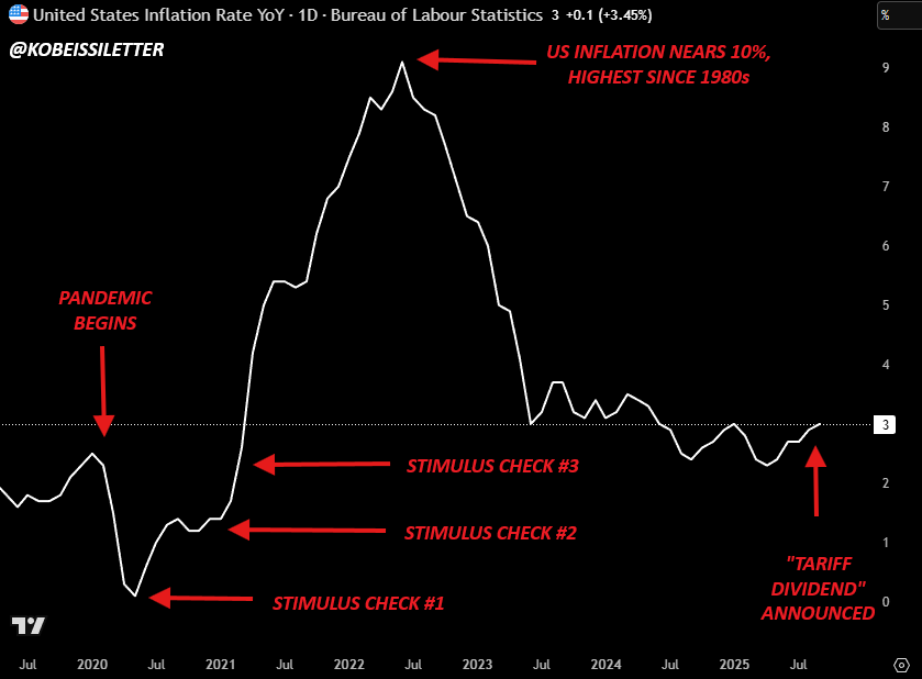 而根据 Kobeissi Letter 的投资分析师的测算,参照过往疫情期间刺激支票的分配模式,目前约有 2.2 亿美国成年人符合领取该刺激支票的领取资格。在形式上,这听起来像一次「财政创新」;在实质上,它是一次政治剧本的重演。先喊口号,刺激市场反映。