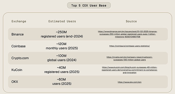 最后按公开注册用户量排序的前五大交易所:Binance、Coinbase、Crypto.com、KuCoin 与 OKX。公开数据显示,五家交易所注册账户总和超过 5 亿。然而,大量用户在多家平台重复开户,导致数字虚高。为得出贴近现实的“真人”基数,我们采用保守调整:假设重复账户占比约 55–60%,据此测算五大所独特用户规模约为 2.0–2.3 亿人。