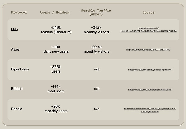 我们在 DeFi Llama 按 TVL 排序锁定前五大协议,并借助公开数据源统计各自的用户地址数。由于链上尚无统一标准来精确去重,我们仅依赖可获得的公开信息做近似估算。