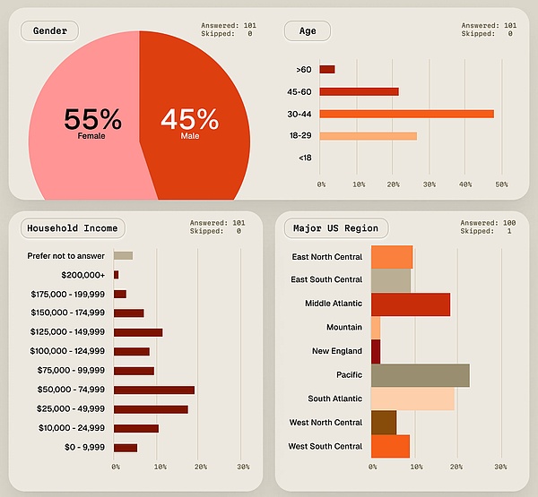 本次调研面向美国普通零售人群,年龄跨度 18–99 岁,覆盖所有收入层级。在 150 份有效样本中,约三分之二(67%)曾持有并使用过加密资产,三分之一(33%)从未接触。为确保结论聚焦于“真实行为”,我们仅对“已入圈”的 101 位活跃持币者进行深入分析,从而剔除零经验噪音。
