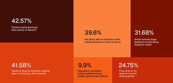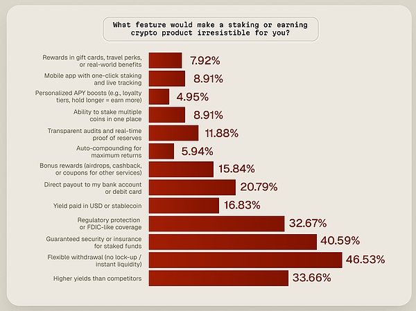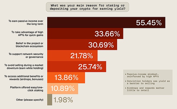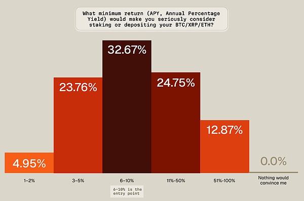 调研显示,散户在收益决策上普遍保守且短视:60% 以上持有加密资产不足一年,只有远高于传统理财的收益才能让他们挪窝——6% 年化是“最低吸引力阈值”,个位数 APY 很难打动人。