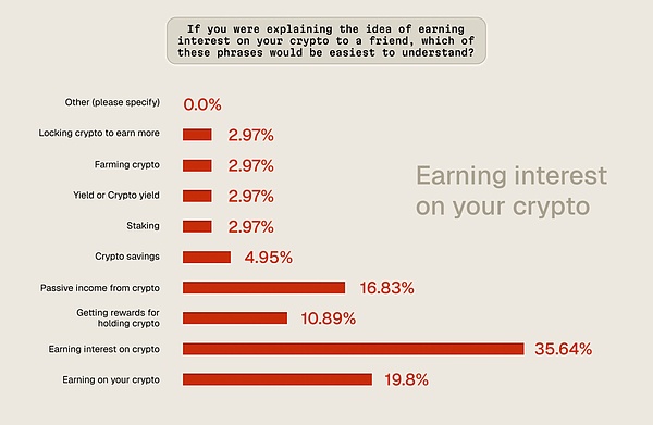 语言决定理解门槛。当受访散户被问及哪种表述最易懂时,压倒性胜出的是:“用你的加密货币赚利息(earning interest on your crypto)。”——它直接对标银行储蓄,无需额外技术背景。
