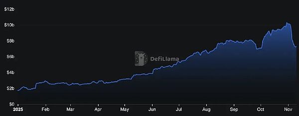 由于此类资金池模式往往能够提供比经典借贷市场(如 Aave)更可观的收益,该模式自然而然地吸引了资金的热逐。Defillama 显示,由各大主理人运维的资金池总规模在过去一年间飞速增长,10 月底及本月初曾一度突破 100 亿美元,截至发文仍暂报 73 亿美元。