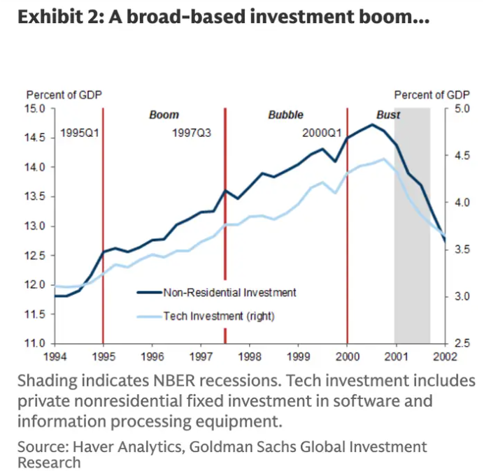 根据高盛的分析,在互联网泡沫破灭前的几个月里,投资支出开始下滑。