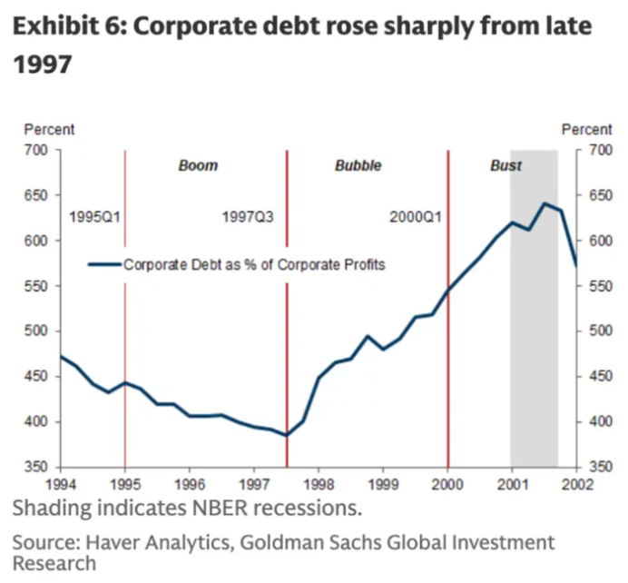 在互联网泡沫破灭前,公司的负债日益增加。高盛的分析显示,企业债务占利润的百分比在2001年达到顶峰,恰好是泡沫破裂之时。