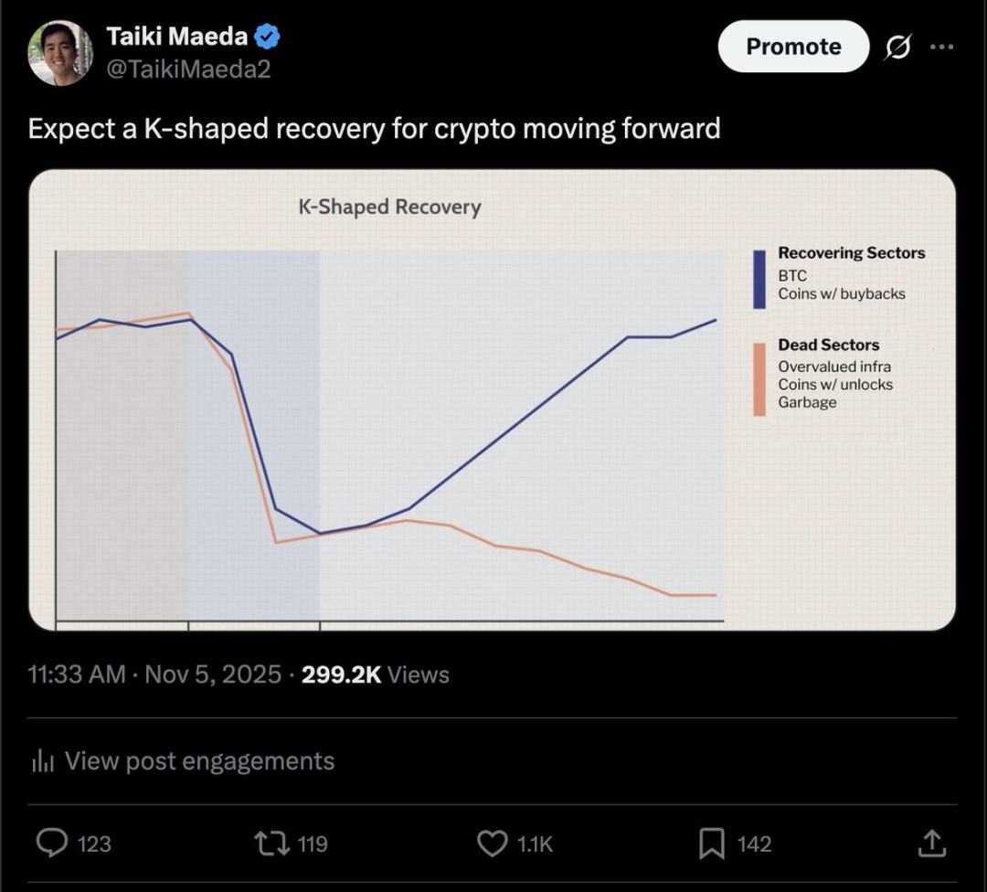 (注:Taiki Maeda 认为加密货币市场未来将呈现 K 型复苏,比特币及有回购的代币等属于复苏板块,估值过高的基础设施、有解锁压力及垃圾项目等所属板块则会衰退 。)