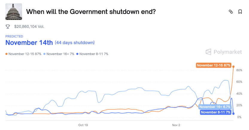 图:11月12日-11月15日美国政府停摆结束概率为87%