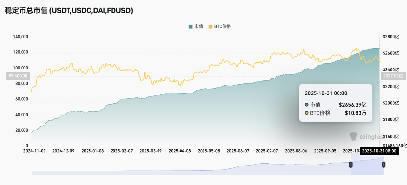目前BTC交易所余额214万,环比不变;ETH交易所余额1222万枚,环比下降1.1%。数据统计截至10月31日,稳定币市值2656亿美元,周度环比不变。
